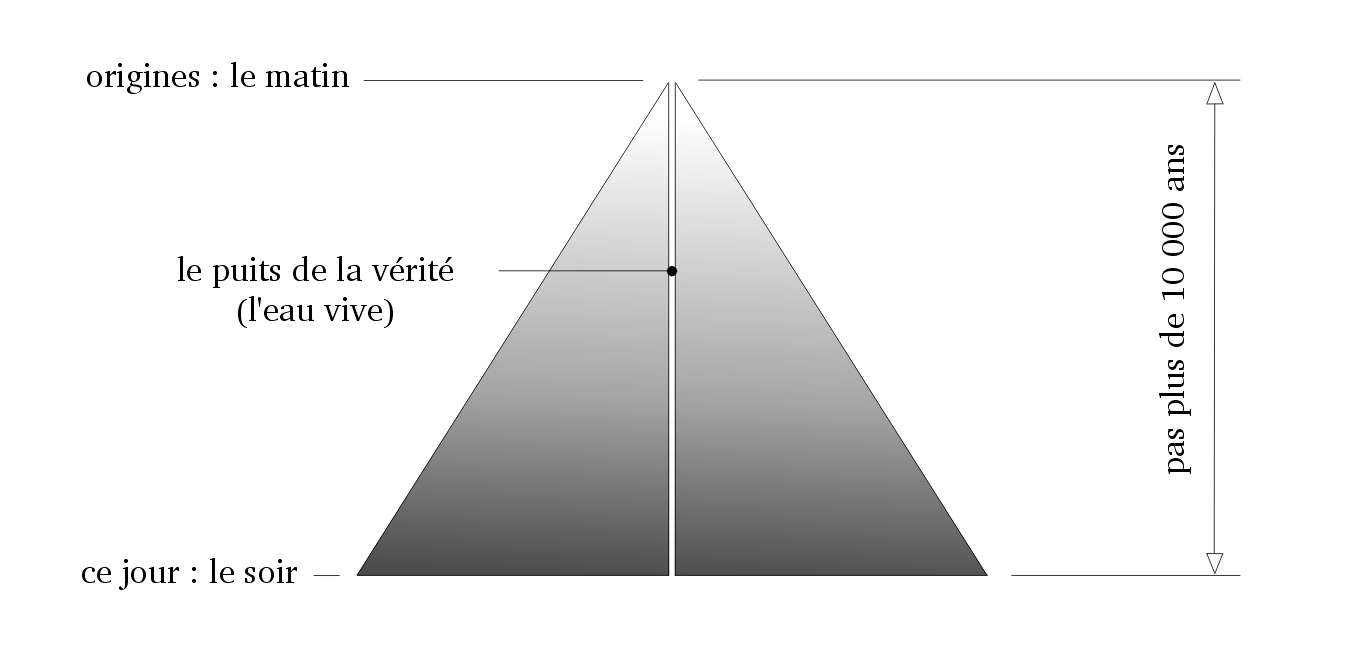 (4) Il sera démontré que le Soleil est une étoile fort jeune qui brille depuis peu de temps, et que lorsqu’il s’est éclairé la Terre entama des va-et-vient auprès de lui, qui déterminèrent les ères. Celles-ci sont les six jours de la création suivis du septième jour : le repos de Dieu. Mais les hommes ne purent apparaître que dans le quaternaire (le sixième jour) qui est le temps dans lequel la Terre s’est stabilisée devant le Soleil. Ne pouvant excéder dix mille ans d’âge, le monde humain est donc fort jeune. Et c’est en raison de cette jeunesse qu’il s’est corrompu ; parce que, tels des enfants qui savent tout, les hommes ne voulurent point pratiquer la loi de Moïse. Ils ne peuvent plus alors discerner le bien et le mal, ni voir quel genre de monde ils ont bâti.