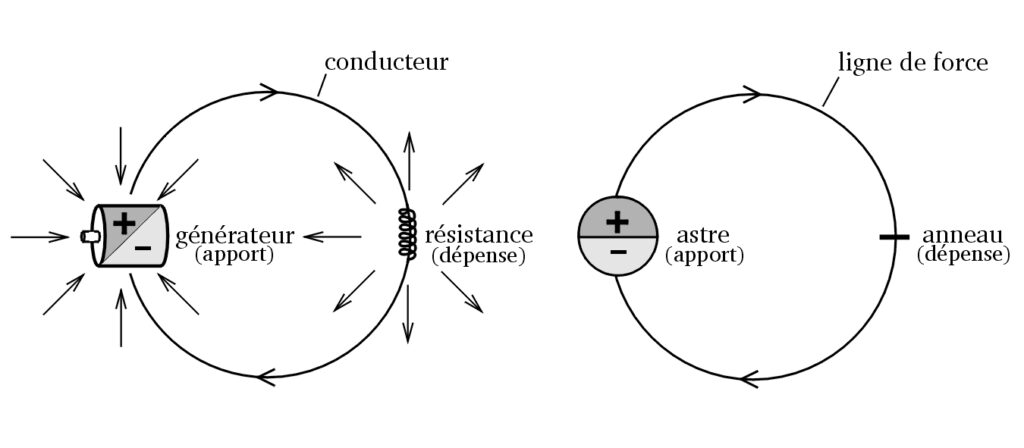 (6) Ne voyez que ce qui est montré, et pensez que l’astre est entouré d’une quantité considérable de lignes de force et non d’une seule comme sur la figure de droite. Si l’on augmentait pareillement le nombre de circuits et de résistances autour d’un générateur, celui-ci fonctionnerait davantage, car plus les résistances sont nombreuses plus le générateur (qui est aussi l’astre) produit de l’électricité. Cela, parce que l’aimant du générateur restaure constamment les lignes électriques en produisant la quantité consommée. Cela nous montre que, dans un cas comme dans l’autre, c’est la dépense qui commande l’apport.