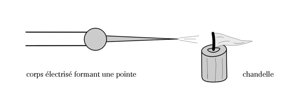 (24) Cette autre étude du comportement électrique, également oubliée, a été effectuée autrefois par celui qui a écrit : Quand un corps électrisé présente une pointe, l’électricité se porte surtout sur cette pointe. A ce moment-là, les molécules d’air voisines sont attirées, puis, après contact, repoussées. Si cette répulsion est assez vive, il se produit un courant d’air capable de souffler la flamme d’une chandelle.