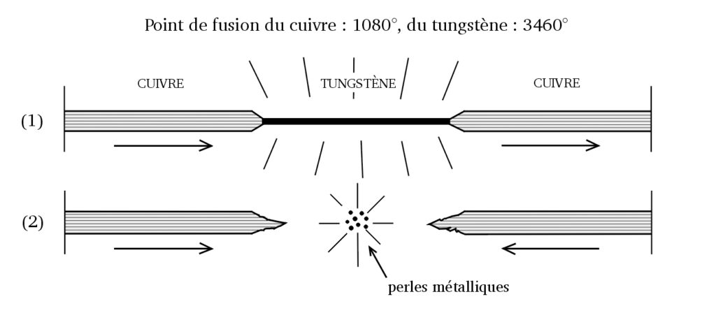 (29) On voit aussi sur la première figure que les électrons cheminent dans le même sens. Supposons alors que l’on retire le filament et que l’on mette ensuite en contact les deux conducteurs. Cette fois, il se produira un grand échauffement (un éclair) qui fera fondre l’extrémité des deux brins conducteurs. La deuxième figure montre cela et que le courant des deux brins se dirige vers le point de contact en provoquant un éclair, mais aussi la formation de petites perles de ferronickel…