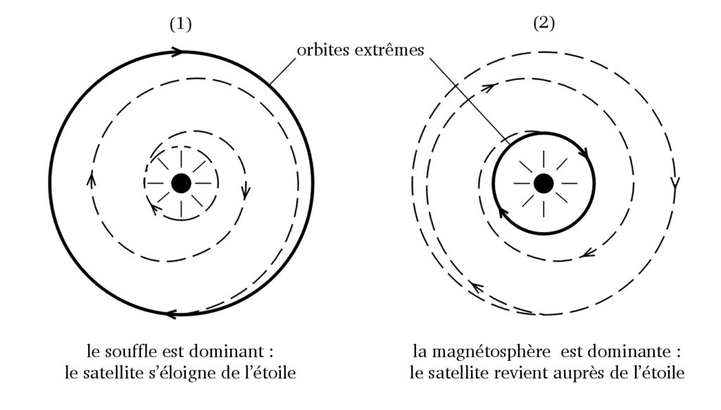 (11) La première figure illustre comment le souffle de l’explosion atmosphérique éloigne le satellite de l’étoile. On voit que son orbite ne cesse de croître durant ses révolutions, que l’on imagine cependant des milliers de fois plus nombreuses que celles représentées. Celles-ci finiront par le conduire sur une orbite lointaine et plus stable, lorsqu’il sera en bout de course. C’est donc la plus grande orbite et, par conséquent, le plus grand éloignement de l’étoile que ce satellite connaîtra. La figure suivante montre ce que sera le retour du satellite lorsque la magnétosphère aura contenu puis inversé son mouvement. Toujours en orbite spiralée, il redescendra vers l’étoile lentement cette fois, jusqu’à ce que le souffle de cette dernière maîtrise son mouvement. Là encore, en bout de course, son orbite sera plus stable. Et cette stabilité durera un temps, le temps qu’il faudra au souffle de l’étoile pour le renvoyer de nouveau dans le lointain, moins fortement cependant que ne le fit l’explosion atmosphérique, donc moins loin que la première fois. Après quoi, notre satellite reviendra doucement et finira par se stabiliser au milieu de ces deux orbites extrêmes qu’il aura connues.