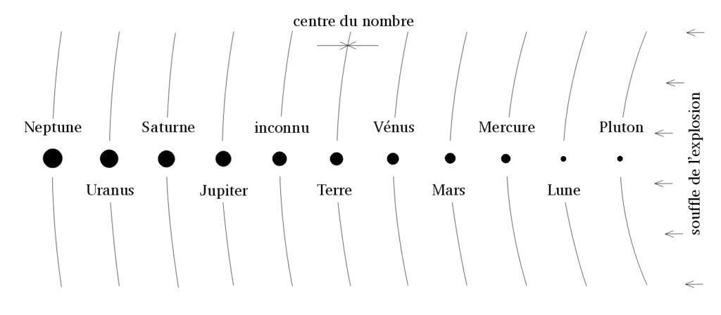 (18) On remarque sur cet alignement, que la Terre était placée au centre du nombre des satellites du Soleil. Cette position est privilégiée, parce qu’il est évident que le souffle de l’explosion ne déplaça pas la Terre comme il déplaça les astres qui se trouvent en deçà et au-delà de sa position. En effet, ceux qui se trouvent entre elle et le Soleil furent plus fortement bousculés que ceux qui viennent après elle. On comprend alors que Pluton peut-être, la Lune, Mercure, et Mars certainement, furent chassés de leur anneau et se refroidirent. Tandis que Vénus, la Terre, Jupiter, Saturne, Uranus et Neptune ne l’ont point fait, en étant moins dérangés par le souffle qui était davantage atténué. Poussée par ce vent, la Terre ne quitta pas son anneau, elle le déforma seulement. C’est pourquoi elle fit des va-et-vient auprès du Soleil que nous examinerons dans le détail, car ce sont eux qui façonnèrent son visage, en raison des gros écarts de température qu’elle connut.