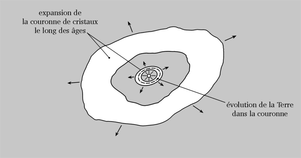(23) Ainsi, durant un long moment, notre planète évolua dans un nuage de cristaux qui lui fournit l’eau qu’elle possède aujourd’hui. En ce temps-là, la Terre n’avait pas encore intercepté la Lune. Et bien qu’elle connut ensuite sa plus grande orbite qui la fit séjourner dans le froid, elle resta chaude intérieurement, surtout que cette couronne la couvrit d’un précieux manteau de glace. Puis elle revint auprès du Soleil qui la réchauffa. Elle traversa encore la région où nous sommes et, tout de suite après, elle intercepta la Lune. Ensuite, elle connut une autre période glaciaire loin du Soleil, puis revint plus près de lui et finit par se stabiliser dans le ciel, sur l’orbite même où nous nous trouvons.