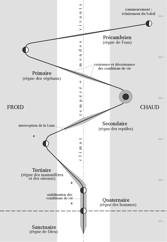(5) Ces éléments primordiaux à partir desquels les êtres trouvent existence, furent tout d’abord minimes dans le PRÉCAMBRIEN qui fut l’ère dans laquelle la Terre se couvrit entièrement d’eau en évoluant longtemps dans le nuage solaire. Il n’y avait que peu de lumière et peu de points chauds en ces temps-là. C’est pourquoi les eaux ne produisirent que quelques rares espèces. Dans le PRIMAIRE, où les terres émergèrent, les conditions de vie se développèrent considérablement, tout comme elles le firent dans le SECONDAIRE, puis davantage dans le TERTIAIRE, et encore plus dans le QUATERNAIRE où elles parvinrent à leur apogée, au comble de ce qu’elles peuvent être actuellement. Il n’y a donc pas eu régression mais progression et enrichissement des conditions de vie jusqu’à présent, et créations de mondes conséquents.