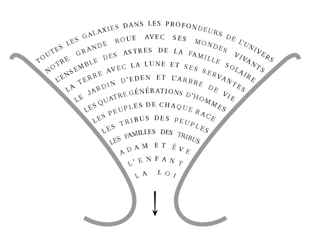 (14) Pour ne pas être répressive, la loi du monde des anges de la Roue est d’abord éducative, conseillère et rédemptrice, car elle permet de se juger soi-même pour ne pas être jugé. Pour cela, il suffit de savoir lire et d’avoir du bon sens. Et, tous, en avez. Mais bien qu’il en soit ainsi, je sais qu’il vous faudra attendre d’être dans le royaume pour saisir pleinement le sens des ordonnances du Tout-Puissant. Vous avez en effet besoin de l’accomplissement entier de la prophétie pour preuve que le monde se sera condamné à disparaître en ne recherchant pas la vérité, ni ses règles de vie qui sont minutieusement exprimées par la loi.