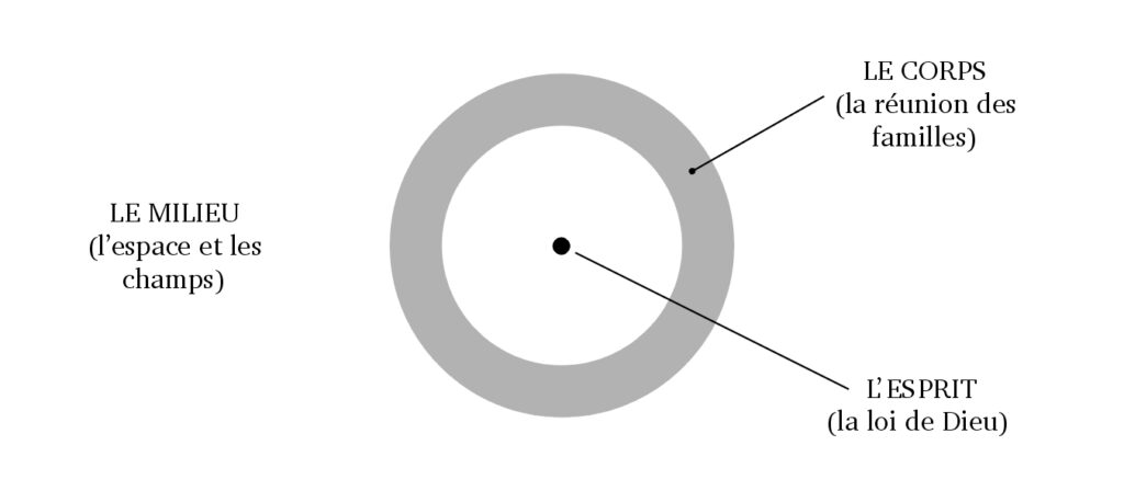 (7) Les anciens racontent que le jour où les élus sortirent de leurs abris sur les montagnes où le Fils les avait assemblés, ils s’empressèrent de représenter sur le sol les trois parties de la ville sainte, ci-dessous, ressemblant au Soleil,